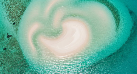 View showing aerial view of a pristine white sand beach meeting turquoise ocean water with swirling patterns. resolution