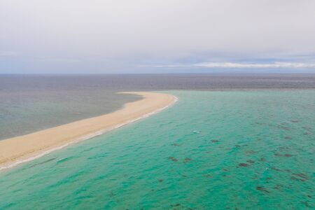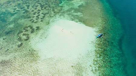 White sandy island with coral reefs.White sandbar.Atoll near the island of Camiguin, Philippines, aerial view.Seascape, white sand island