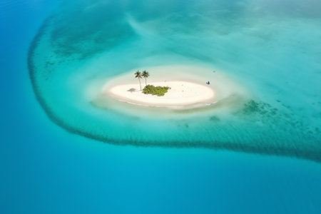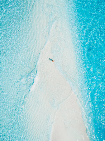 stunning blue ocean and sandy white island maldives top drone aeral view deserted hidden Maldives beach copyspace for text
