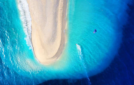 Aerial view on the beach and windsurfer. Beach and sea from air. Famous place in Croatia. Summer seascape from drone. Travel - image