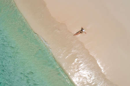 young woman tanning sunbathing woman wearing bikini at the beach on a white sand from above view from drone