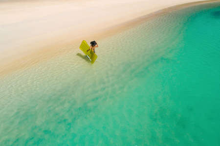 Tourist on tropical white sandy beach with blue ocean water. Aerial view, top down