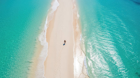A breathtaking aerial view of a sandy island surrounded by crystal clear Caribbean water. The natural landscape includes a beautiful beach and fluid wind waves AIG50