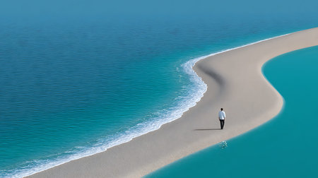 A lone figure strolls along a curved sandy beach surrounded by calm turquoise waters.