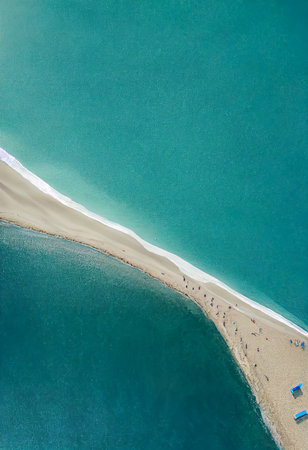 Stunning aerial perspective of a sandy beach extending into vibrant turquoise waters in Kassandra, Halkidiki, Greece, showcasing natural beauty