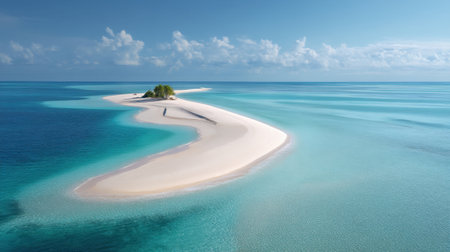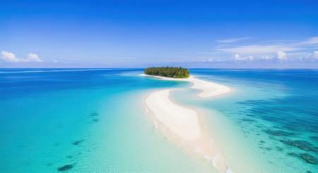 Experience ultimate tranquility on a secluded tropical island surrounded by vibrant turquoise ocean waters and a shimmering white sandbar leading to lush greenery.