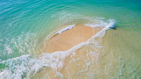 Sand beach aerial, top view of a beautiful sandy beach aerial shot with the blue waves rolling into the shore. Amazing ocean bay lagoon, turquoise sea white sand, horizon