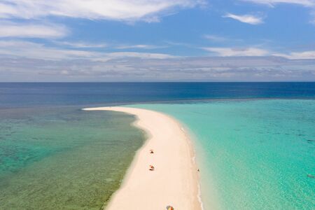 Tropical white island and sandy beach with tourists surrounded by coral reef and blue sea, aerial view. Sandbar Atoll. Island with sand bar and coral reef. Summer and travel vacation concept, Camiguin, Philippines.