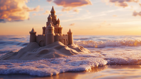A whimsical sandcastle on golden sand, with ocean waves approaching and bright summer sun creating a magical vibe