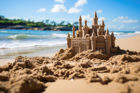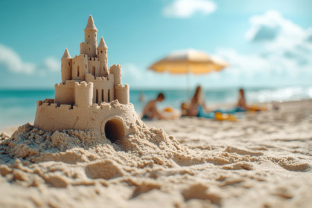 Intricate sandcastle towers and turrets rise majestically on the shore, showing childrens creativity. Perfect for beach day fun, inspiring imaginations to soar under the sun.