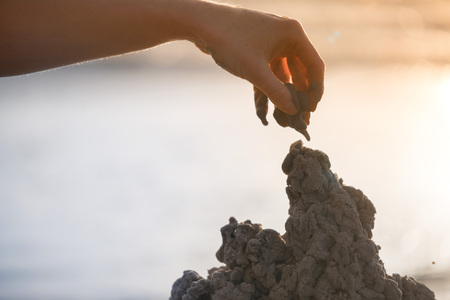 Close up of a mans hand carefully placing the top of a sandcastle tower on a sunny beach, savoring the joy of a relaxing summer vacation by the ocean waves and warm sun