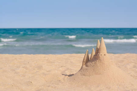 Sand castle on the beach with blue sea on background. Summer holidays and travel. Family vacation
