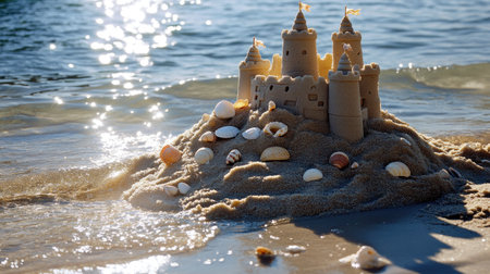 A beautifully crafted sandcastle sits by the shore, adorned with seashells and surrounded by glistening water under warm sunlight, evoking summer joy and creative play.