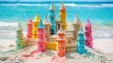 Colorful sandcastles stand proudly on a sunlit beach, surrounded by shimmering waves and glistening sand, capturing the essence of summer joy.