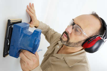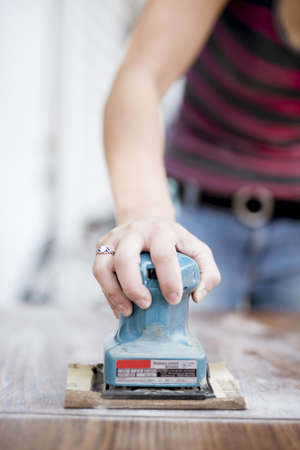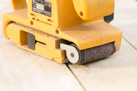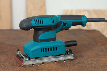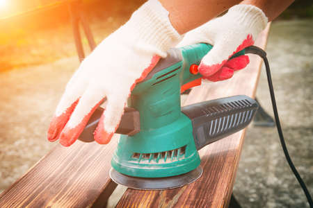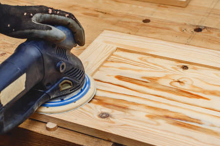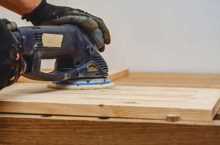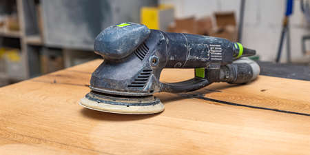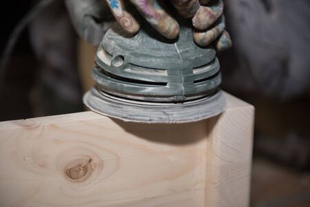 Joiner's tools. Sanding a wooden board with a hand-held electric sander
