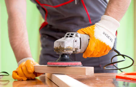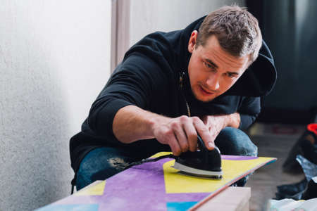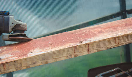 a man is grinding a board. Removing old paint from boards. Carpentry work. selective focus