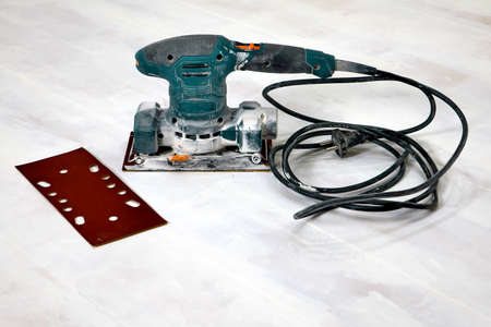 Electrical Sanding Machine On The Paint Wooden White Floor With Sandpaper