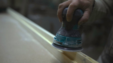 Worker sands wooden boards using a vibration sander in a workshop, close up. Power tool