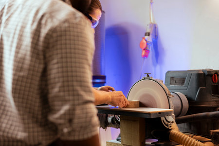 Artisan in studio enjoying diy hobby, using orbital sander with fine sandpaper on lumber to achieve smooth finish. Creative person in carpentry shop uses angle grinder to create wooden objects