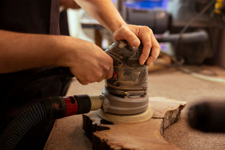 Carpenter holding power tool used to smooth surfaces by abrasion with sandpaper, using it on wood piece. Man using orbital sander equipment for furniture assembling job in studio