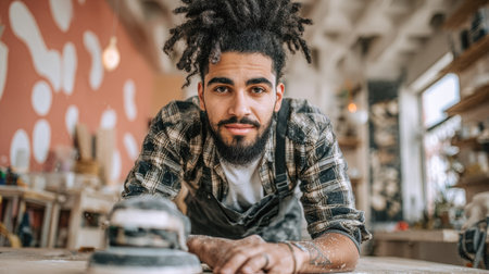 Focused male craftsperson, wearing a plaid shirt and apron, lies on a work surface, likely wood or other material, with tools and sawdust in a workshop.
