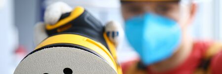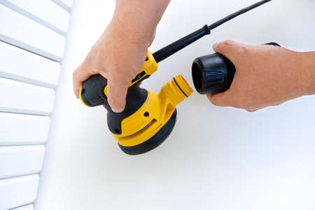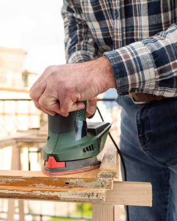 Close-up of professional carpenter polishing wood with sander machine. Macro shot of worker holding special equipment. Construction site and renovation works concept