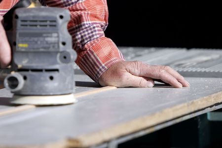 A close up photo of a man sanding a piece of wood with an electric sander.