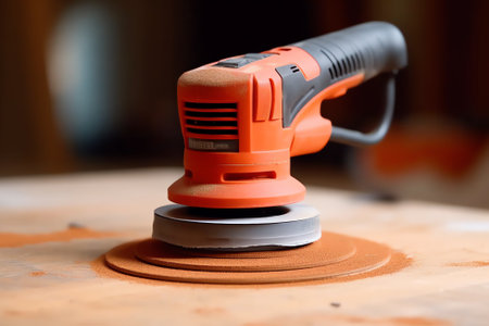 Close-up of a carpenter at workshop polishes a wooden board with an electric orbital sander, on a dark workshop. Generative Ai.