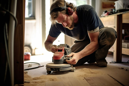 Detail of a electric sander on the natural wooden floor of his house. Space for text. Work, home decoration and DIY concept.