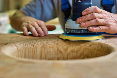 Hands a man polishes a wooden part with a grinding machine. Carpentry production. Working with wood