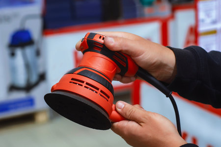 Hands holding bright orange and black electric orbital sander with round sanding pad in hardware store. Professional woodworking power tool equipment