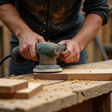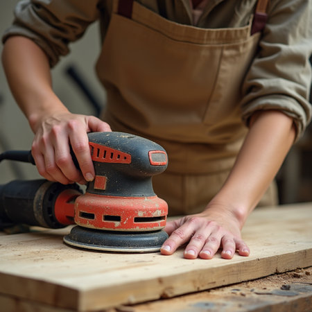 Fingers gently guide a sander across a wooden surface, as fine dust dances in the warm light. This moment captures the blend of craft and care in a peaceful workshop setting.