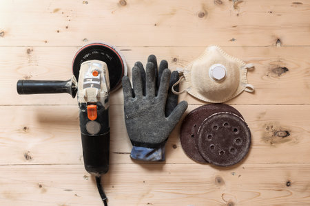 Electric sander, safety glove, respirator mask and sanding discs neatly arranged on clean wooden boards, ready for woodworking tasks.