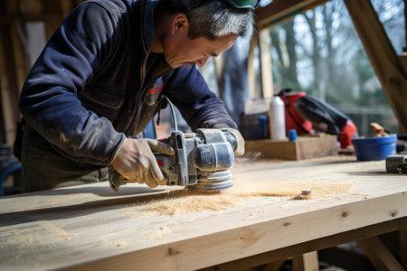 Generative AI : Focused adult woodworker in apron and protective gloves using electric grinder while polishing wooden detail in craft workshop
