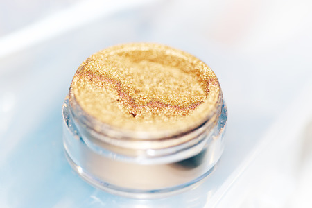 A small jar with make-up pigment. Very selective focus.