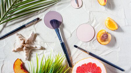 Dry cosmetic decorative product in a round refile lies on the sand, surrounded by bright fruits, corals, and palm leaves. Powder, highlighter, bronzer, blush with a brush. Close-up, top view