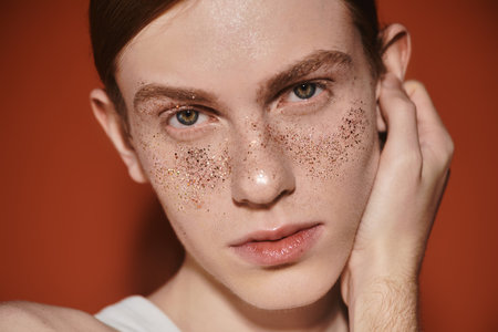 Young man with red hair and freckles displays a fashionable look against a striking backdrop.