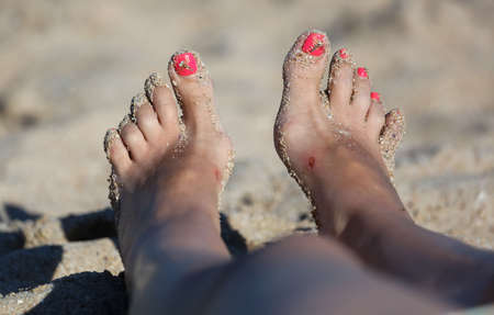 Girl's feet in the sand by the sea. Recreation