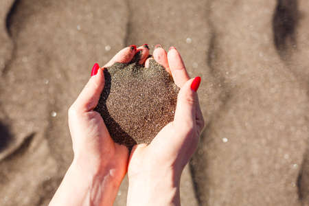sand in the hands of a girl in the summer at sea