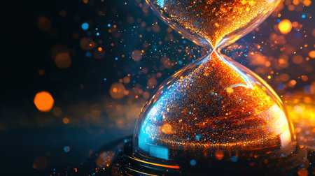 A captivating glass hourglass filled with shimmering gold glitter, capturing the essence of time passing. The sparkling sand flows gracefully, creating an alluring visual spectacle.