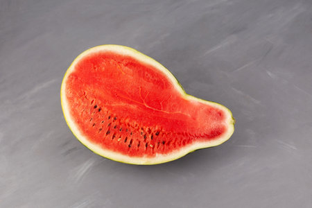 Half of pear-shaped watermelon. Deformed ugly watermelon. Concept - Food waste reduction. Eating imperfect foods.