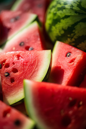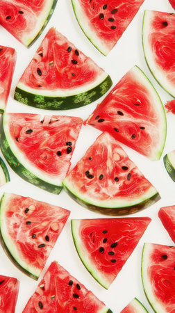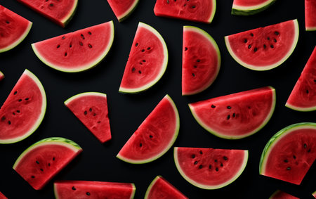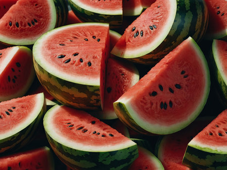 Juicy, colorful watermelon slices and cubes arranged as a refreshing background, showcasing the vibrant red fruit and green rind
