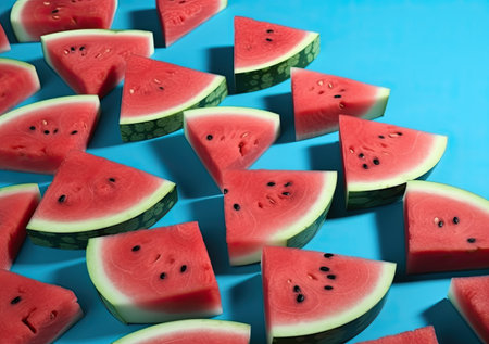 Sliced watermelon on a blue background, healthy and refreshing summer food by generative AI