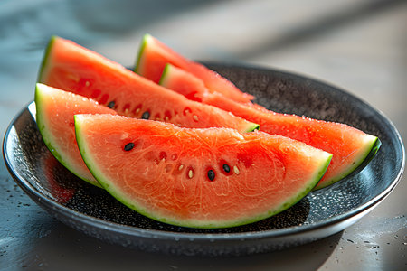 Juicy watermelon slices arranged on a black plate, showcasing vibrant red and green hues. sparkling dew drops enhance the fresh, appetizing appearance. ideal for food photography, healthy eating inspiration, summer themes, and design projects. Generative AI