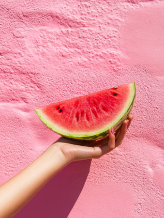 Fresh, vibrant watermelon slices are artfully arranged on a lively pink background, creating a cheerful vibe perfect for summer gatherings and healthy snacking.