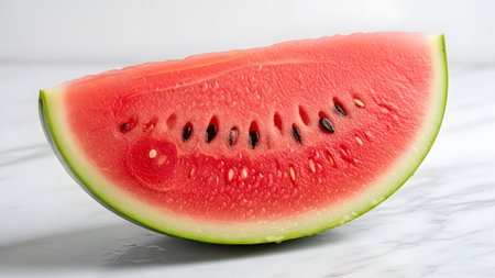 A vibrant and refreshing slice of ripe red watermelon with visible seeds on a white marble surface