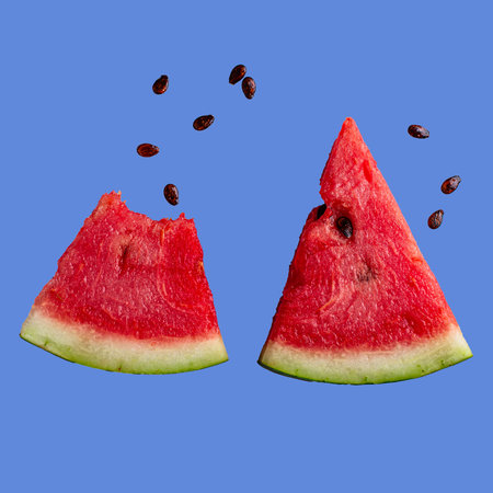 Fresh and juicy watermelon slices on vibrant blue background under the warm sun light
