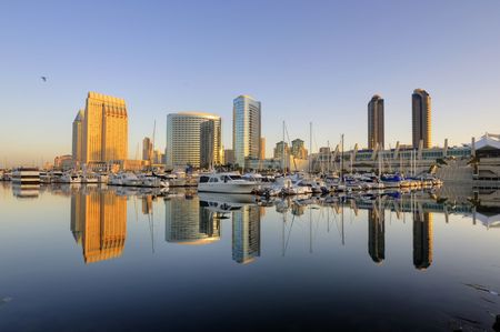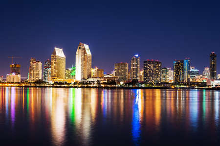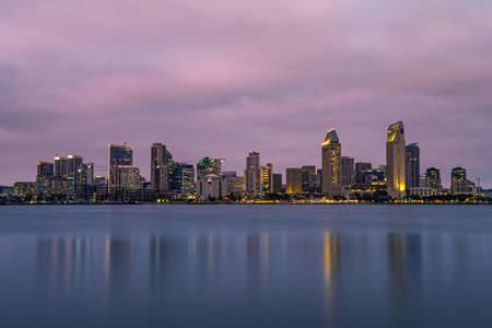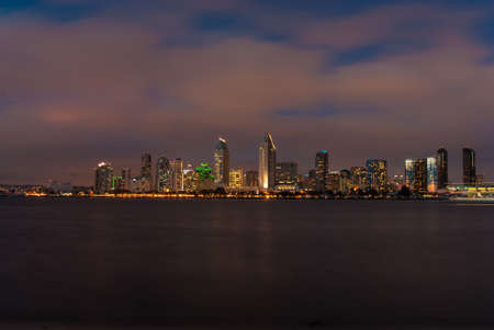 The beautiful San Diego skyline at twilight, seen from the isdland of Coronado, looking out over the bay.