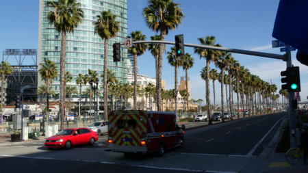 San Diego, California USA - 13 Feb 2020: AMR american medical response ambulance car. EMS emergency service red vehicle, city street in downtown. Paramedic rescue truck. 911 public safety. Harbor Dr.