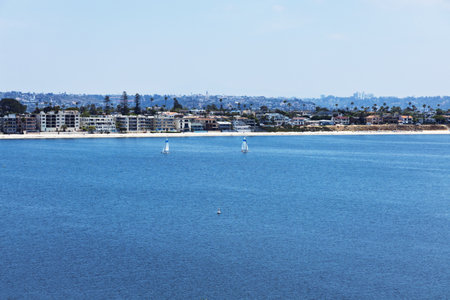 Bird eye view of calm waters of Sail Bay with yachts and distant sandy beach in front of numerous resorts and tourist housing, San Diego, CA